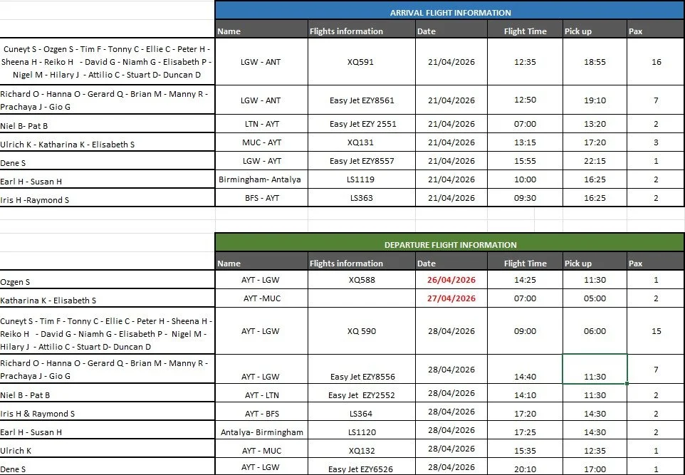 The group will play 5 rounds of golf in Antalya Cornelia Faldo Club golf courses. There will be two rounds of Texas Scramble team event and three rounds of individual Stableford golf rounds. A Microsoft Teams meeting held with participation of Gerard, Duncan, Stuart and Richard on Saturday 28th March at 17:00 and tee times & groups established through an online draw. The team and individual games tee times and players is provided below: